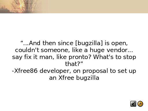 The original text of this slide read 'Crazy X quote here.' Now, I'm going to poke fun at what a few people have said about bugzilla. Most of these people have written a lot of code; some of them are even quite sane :) So while I poke fun of them, they do have a point- they haven't been educated about the benefits of bugzilla and a QA process, or their organization's QA process fails. Is Dave Miller here? Dave, you're in good company, and you might even be right :) I'll say this again, but qa processes are a social hack- if reasonable people are complaining about bugzilla, it actually might mean something is wrong :)