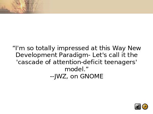 Jamie claims that GNOME closes most bugs by just saying 'we've rewritten, sorry we've ignored your bug for two years.' To give some context, all-time, we've closed 19068 bugs as duplicates, 29025 bugs as FIXED, 10002 as NOTABUG/WONTFIX, and 727 as GNOME1.x, the resolution Jamie complained about.