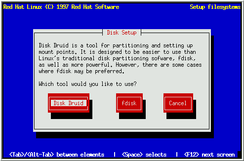 If you would rather use fdisk, select Cancel, and press [Space]. You can then select fdisk from the ``Disk Setup'' dialog box.