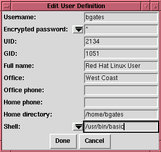 First enter the user name. This is not the user's first and last name; it is the id they will use to log on to the system. Do not include any spaces or colons, and do not enter more than 8 characters. Press the enter key when you are finished, and some of the other fields will be filled in with default values. You may change them if you wish, but it is not necessary. You can, at your option, enter the user's full name, office, and phone numbers. The login shell can be changed from the default (normally /bin/bash) either by choosing a selection from the drop-down menu or by simply typing in the shell like the other fields.
