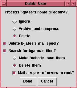 To remove a user, select a user in the main window by clicking on it, and then click on Remove. You will be presented with the dialog box presented in Figure 51. There are three types of action you may take. You may ignore the user's home directory, leaving it alone, you can archive and compress it into a .tar.gz file, or you can delete it completely. You can delete the user's mail spool if you like. These first two actions will take place immediately after you confirm the deletion, before the tool accepts more input. You can search for files owned by the user on parts of the filesystem other than the user's home directory and either give ownership to the user nobody or delete them. If you choose to search for the user's files, you have the option of mailing a report of the errors to root. This is important because the searching will be done in the background as you continue to work; it may take a long time. To find files owned by nobody, execute the following command: