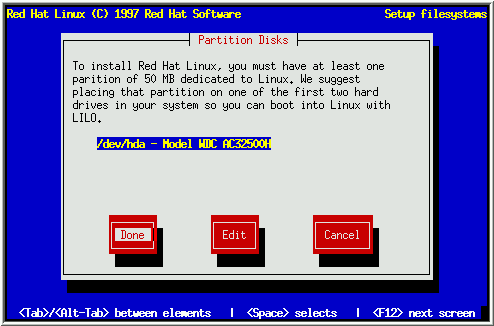 If you'd rather use fdisk to manage partitions, this is the section for you. Once you've selected fdisk, you'll be presented with a dialog box entitled ``Partition Disks'' (see Figure 20). In this box is a list of every disk on your computer. Move the highlight to the disk you'd like to partition, select Edit, and press [Space]. You will then enter fdisk and can partition the disk you selected. Repeat this process for each disk you want to partition. When you're done, select ``Done''.