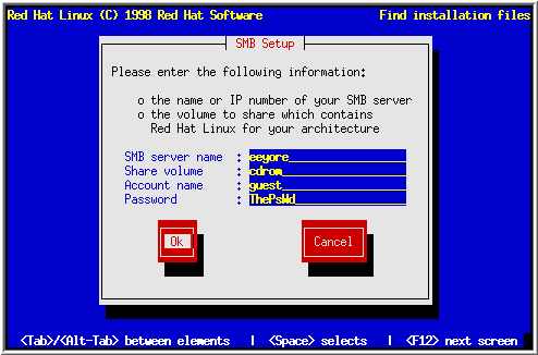 At this point, you should have entered all the necessary network information, and should now be looking at the ``SMB Setup'' dialog box. This is where you'll specify which SMB server, share, and account information the installation program should use (See Figure 26).
