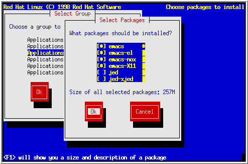You may view a detailed description of the currently-highlighted package by pressing [F1]. A dialog box will appear containing a description of the package. You can use the arrow keys to scroll through the description if there is more than can fit on the screen. When you're done reading the description, press Ok, and the box will disappear. You can then continue selecting packages (and viewing their descriptions).