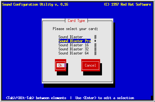 To set up your sound card, run /usr/sbin/sndconfig. Note that you must be root in order to run sndconfig. After an initial screen, you'll be asked to select the type of sound card you have (See Figure 49).